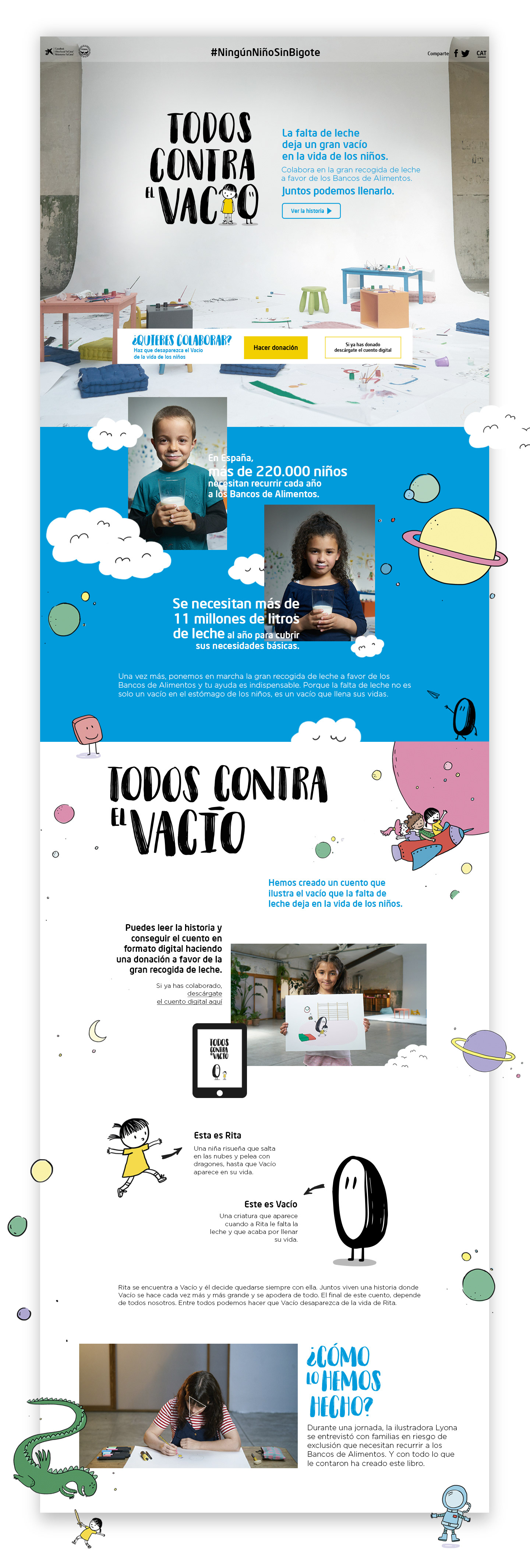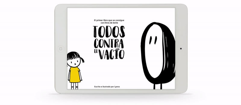 Creamos una campaña transmedia a partir del contenido del cuento «Todos contra el vacío» a través de nuestra web y en las propias oficinas de La Caixa, se podía donar y conseguir el libro. El primer libro que de compra con litros de leche.